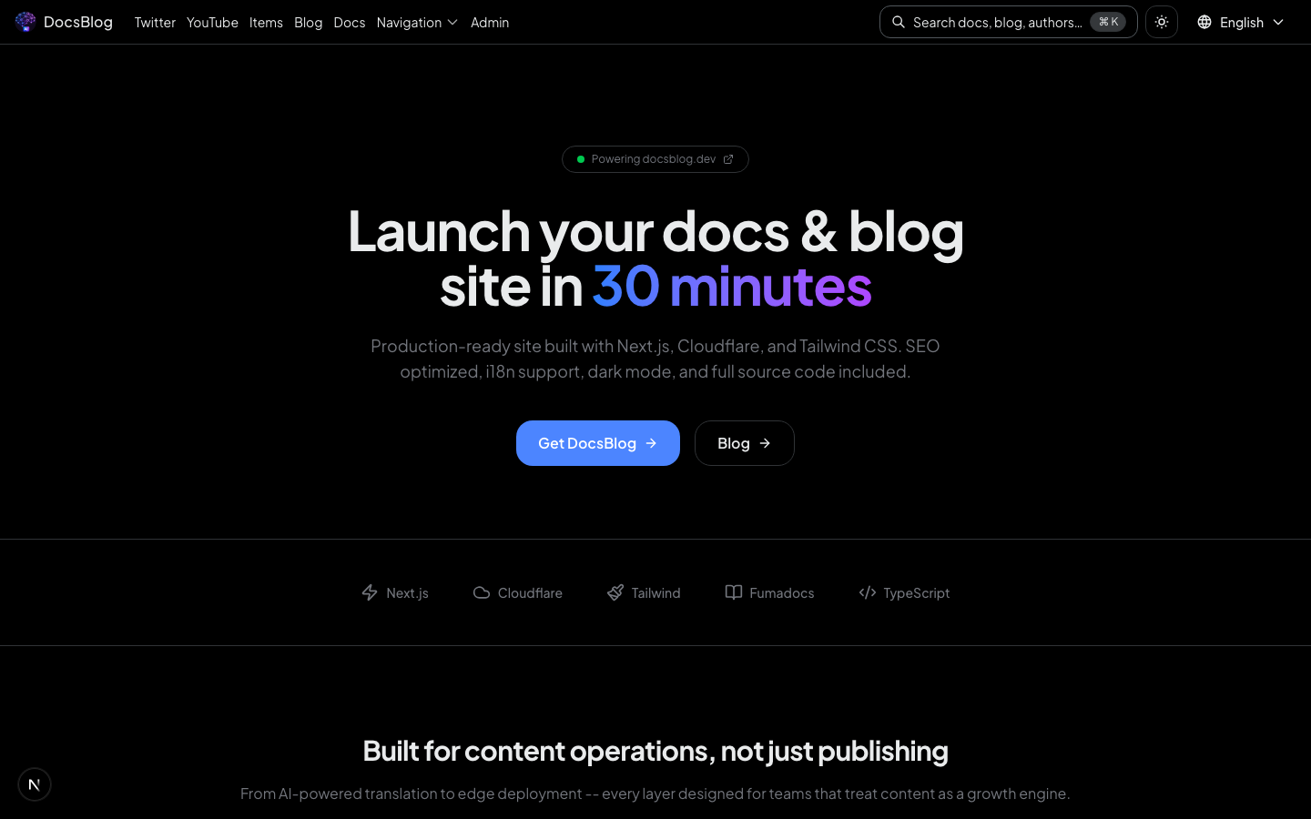 docsblog-app is more than a template — it's a production-ready content platform. Out of the box, your visitors get a polished, fast, SEO-optimized experience across blog, documentation, social media, and navigation.
