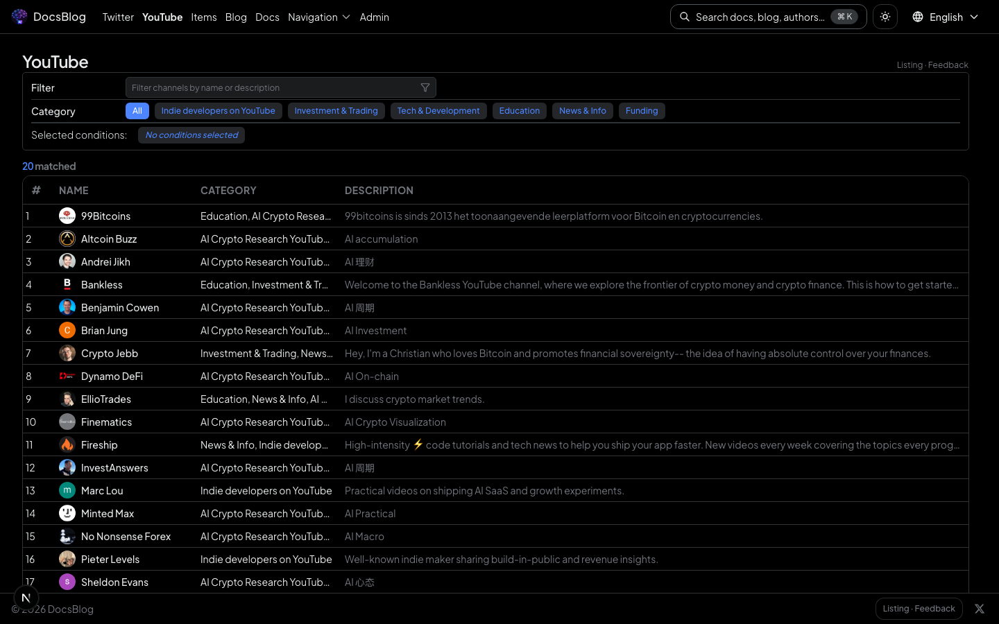 Curate and showcase Twitter accounts and YouTube channels that matter to your audience — with high-performance rendering and category-based organization.